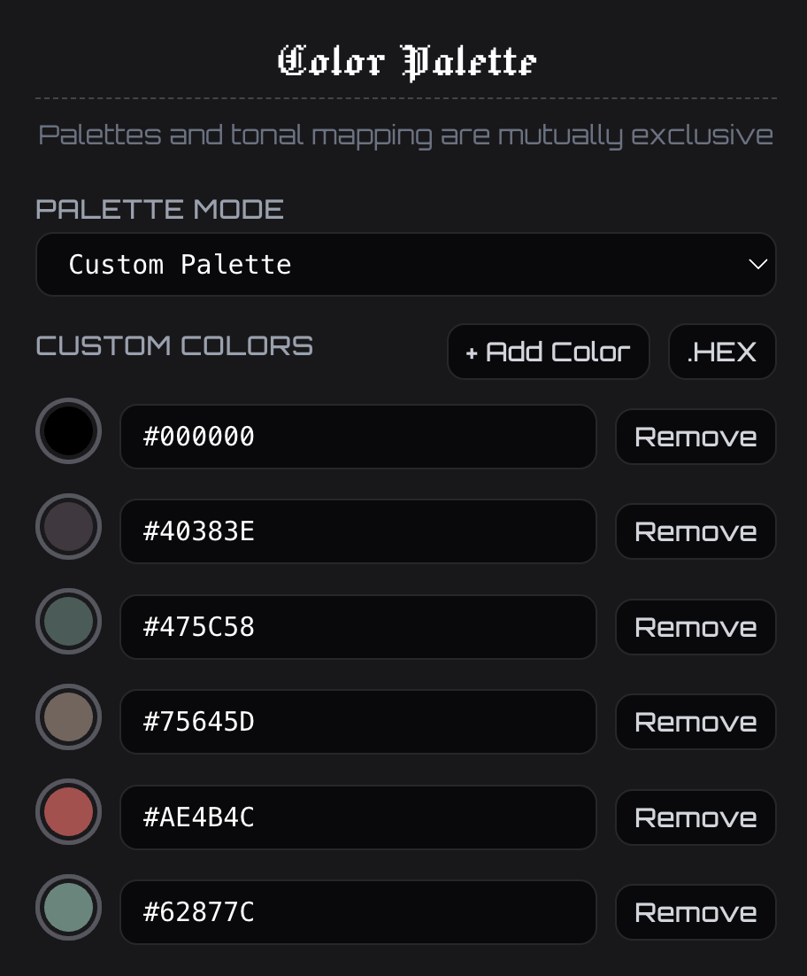 - Allow manual palette creation from inside the tool (select “Custom Palette” in Palette Mode)
